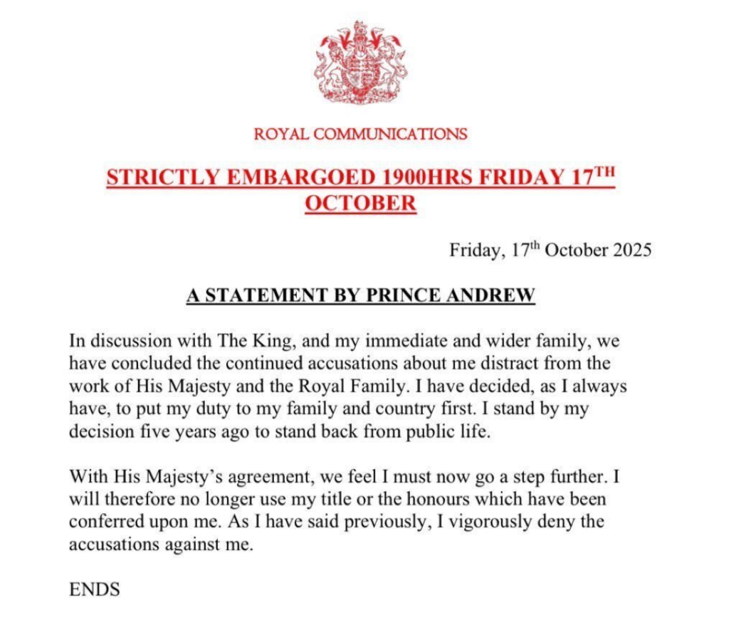 El príncipe Andrew anunció que dejará de utilizar su título y los honores reales que le habían sido conferidos. En un comunicado fechado el 17 de octubre de 2025, explicó que, tras discutirlo con el Rey y su familia, concluyeron que las acusaciones en su contra continúan afectando el trabajo de la monarquía. Afirmó que mantiene su decisión de retirarse de la vida pública, tomada hace cinco años, y que su deber está con su familia y el país. Concluyó reiterando que niega enérgicamente todas las acusaciones.