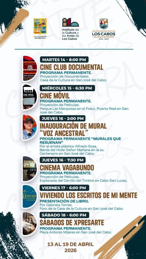 Desde ayer 14 de abril, San José del Cabo y Cabo San Lucas iniciaron una agenda cultural en espacios públicos para acercar el arte a más colonias. Habrá Cine Club Documental en la Casa de la Cultura de SJC, Cine Móvil en el parque Las Mariposas y Cinema Vagabundo en el Cerrito del Timbre.