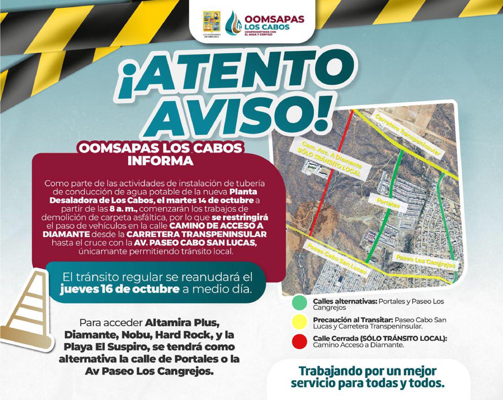 El Organismo Operador Municipal del Sistema de Agua Potable, Alcantarillado y Saneamiento (Oomsapas) Los Cabos informó que a partir del martes 13 de octubre a las 8:00 de la mañana se realizarán trabajos de demolición de carpeta asfáltica como parte del proyecto de instalación de la nueva tubería de conducción de agua potable para la Planta Desaladora de Los Cabos.